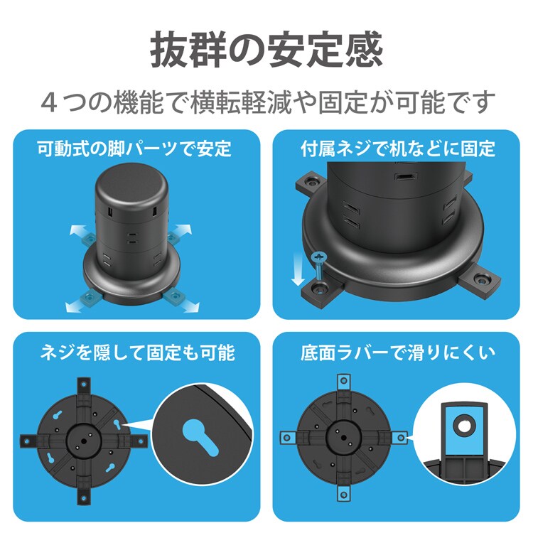 ●脚パーツには滑り止め部材を装備し、接続されたケーブルが引っ張られた際などにも、本体が横滑りしにくくなっています。穴が開いており、付属ネジを利用した仮固定が可能です。