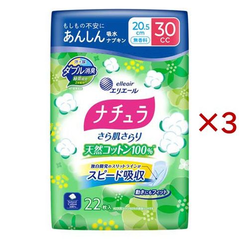 ナチュラさら肌さらり天然コットン100%あんしん吸水ナプキン20.5cm30cc (22枚入×3セット)