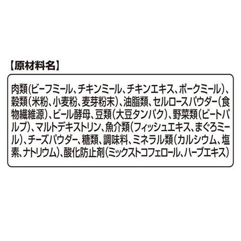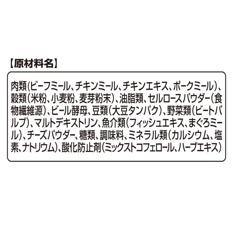 | 肉類(ビーフミール、チキンミール、チキンエキス、ポークミール)、穀類(米粉、小麦粉、麦芽粉末)、油脂類、セルロースパウダー(食物繊維源)、ビール酵母、豆類(大豆タンパク)、野菜類(ビートパルプ)、マルトデキストリン、 魚介類(フィッシュエキス、まぐろミール)、チーズパウダー、糖類、調味料、ミネラル類(カルシウム、塩素、ナトリウム)、酸化防止剤(ミックストコフェロール、ハーブエキス) |