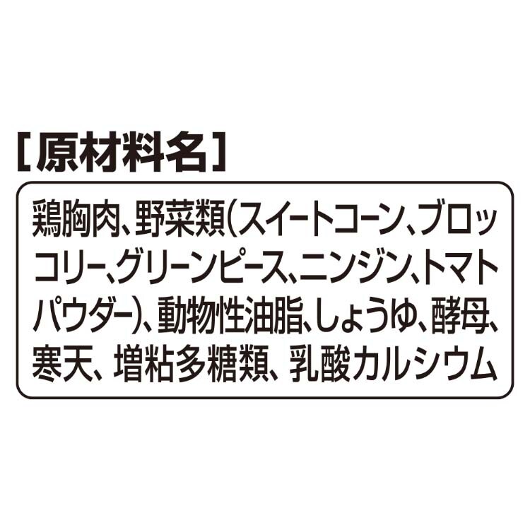 | 鶏胸肉、野菜類(スイートコーン、ブロッコリー、グリーンピース、ニンジン、トマトパウダー)、動物性油脂、しょうゆ、酵母、寒天、増粘多糖類、乳酸カルシウム |