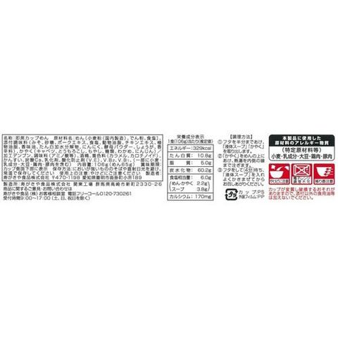 エネルギー:329kcal、たんぱく質:10.8g、脂質:5.0g、炭水化物:60.2g、食塩相当量:6.0g、食塩相当量内訳(めん・かやく:2.2g、スープ:3.8g)カルシウム:170mg