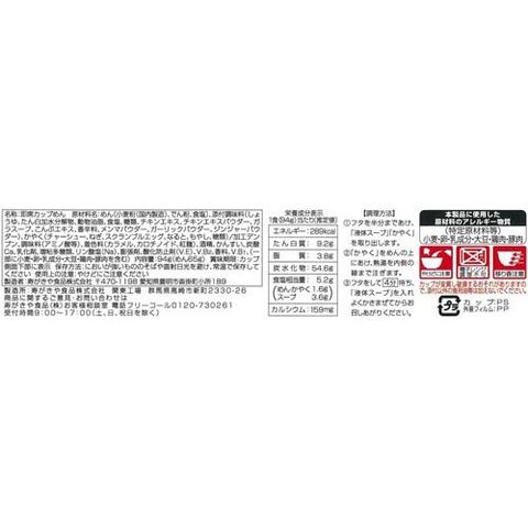 | 1食(94g)当たり(推定値) エネルギー:289kcal、たんぱく質:9.2g、脂質:3.8g、炭水化物:54.6g、食塩相当量:5.2g、食塩相当量内訳(めん・かやく:1.6g、スープ:3.6g)カルシウム:159mg |