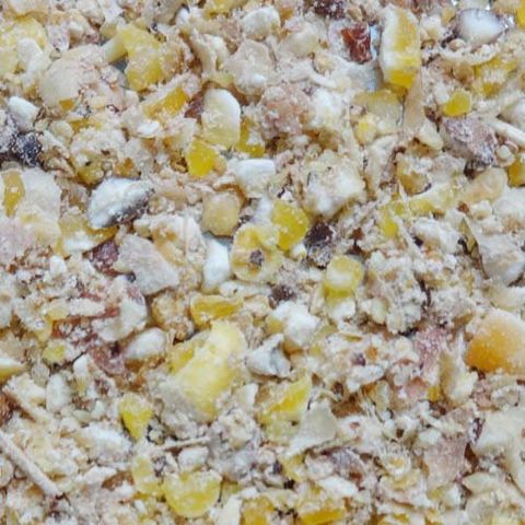 | とうもろこし、マイロ、大豆油かす、なたね油かす、(コーングルテンミール)、とうもろこしジスチラースグレインソリュブル、米ぬか油かす、ふすま、魚粉、(ポーク・チキン原料混合ミール)、炭酸カルシウム、動物性油脂、リン酸カルシウム、食塩、イソマルトオリゴ糖シロップ、(アルファルファミール) |