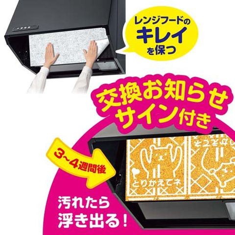 ・交換お知らせサインが出ましたらお早めにお取替えください。汚れたままで使用されますとフィルターが目詰まりし、換気能力が落ちレンジフード本体の性能に悪影響を及ぼす恐れがあります。