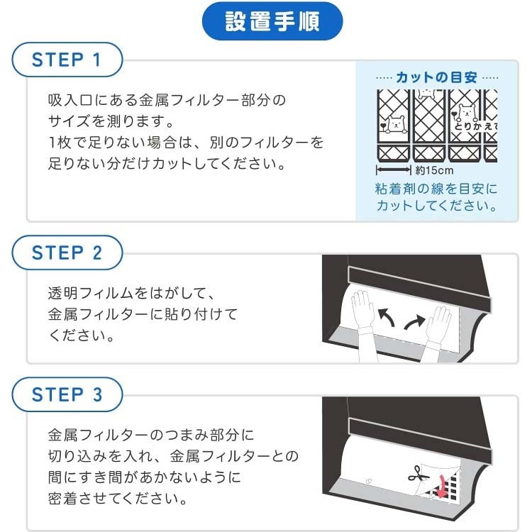 (2)透明フィルムをはがして、金属フィルターに貼り付けてください。※レンジフードの端にフィルターの端をしっかり合わせて貼り付けてください。