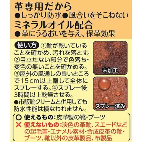 | ・使えるもの:皮革製の靴・ブーツ ・使えないもの:淡色の革靴、スエードなどの起毛革・エナメル素材・合成皮革の靴・ブーツ、靴以外の皮革製品、布製品 ※皮革や加工方法によって十分な防水性能が得られないことがあります。 ・標準使用量:本缶1本で紳士用革靴、約18足にスプレーできます。 |