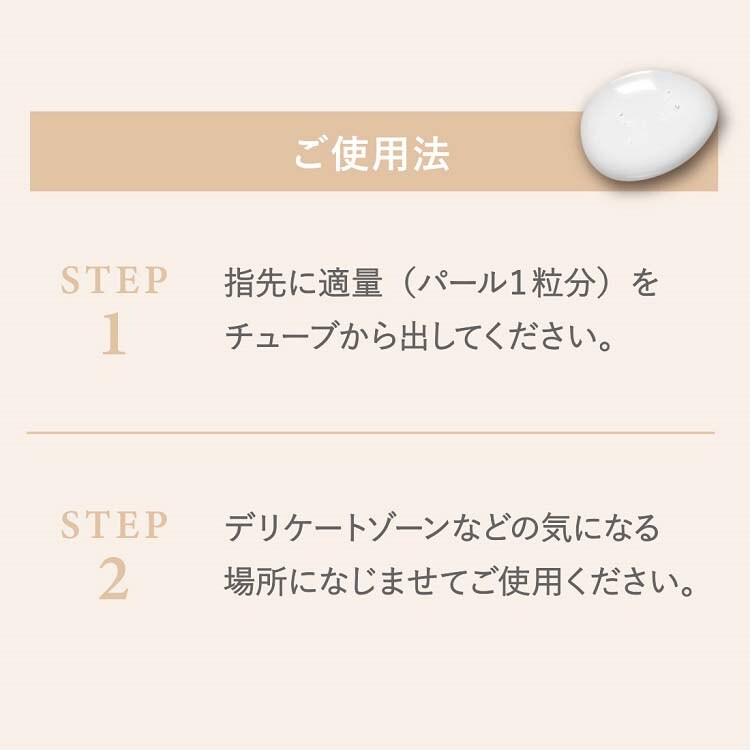 適量(パール1粒分)を手にとり、デリケートゾーンなどの気になる場所になじませてご使用ください。清潔なお肌にご使用ください。