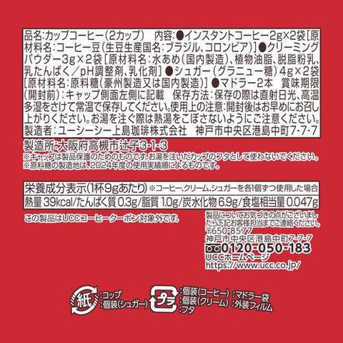 | 合計2杯分(インスタントコーヒー:2g×2袋、クリーミングパウダー:3g×2袋、シュガー(グラニュー糖):4g×2袋、マドラー:2本) |