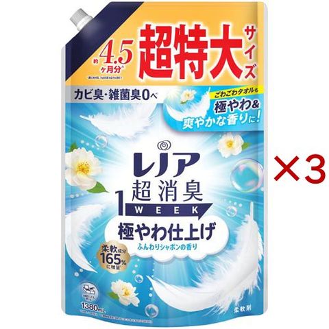 レノア 超消臭1WEEK 柔軟剤 極やわ仕上げ ふんわりシャボンの香り 詰め替え 超特大 (1380ml×3セット)