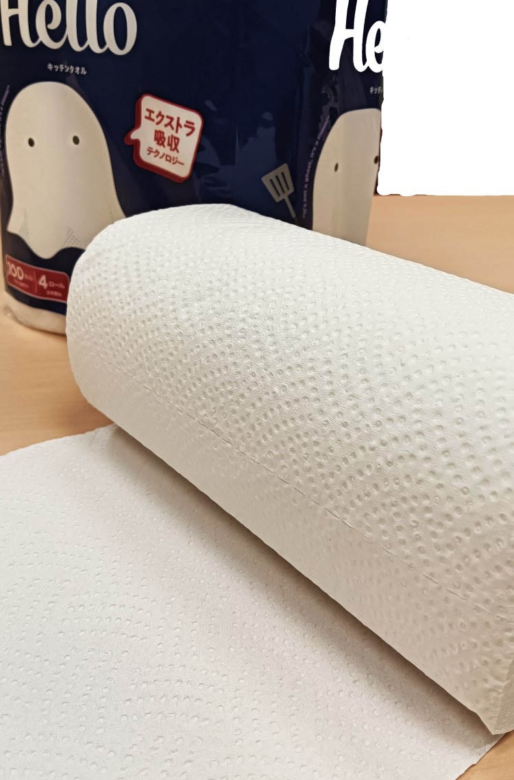 ●2枚重ねタイプだからエンボス加工で吸水性が良く、破れにくい、優れた吸収性で水や油をきれいにふき取る。