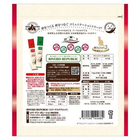 | (まぐろ) まぐろ、玄米粉(鳥取県産米100%) (かつお) かつお、玄米粉(鳥取県産米100%) |