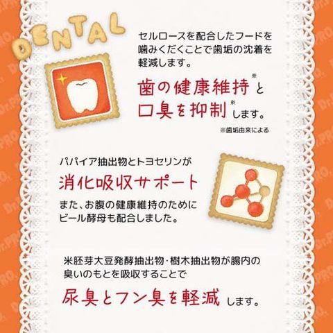 ●このセルロースを配合したフードを噛みくだくことで、歯垢の沈着を軽減し、歯の健康を維持します。