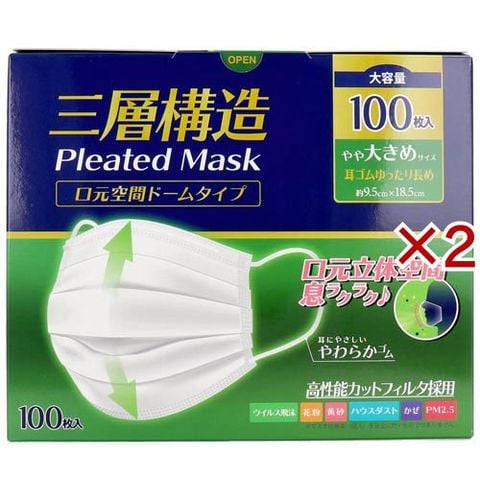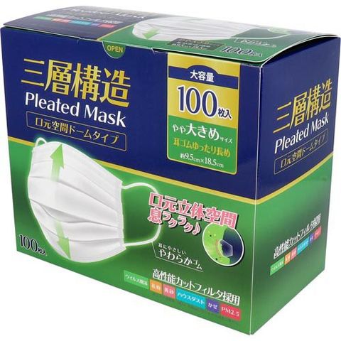 三層構造プリーツマスク 口元空間ドームタイプ やや大きめサイズ 大容量 (100枚入×2セット)