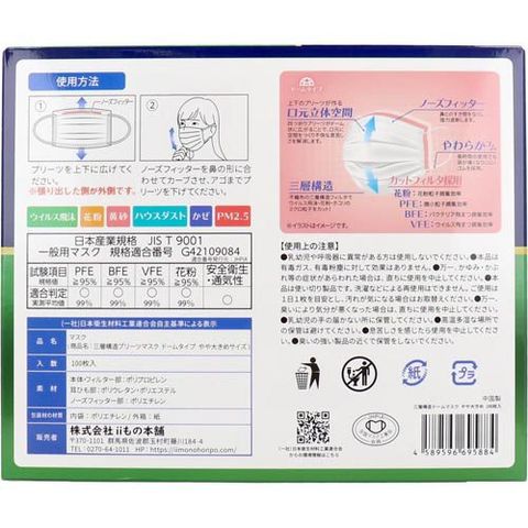 | 個装重量:約415g 内容量:100枚入 ★素材 本体・フィルター部:ポリプロピレン 耳ひも部:ポリウレタン、ポリエステル ノーズフィッター部:ポリエチレン ★サイズ やや大きめサイズ(耳ゴムゆったり長め):約9.5cm×18.5cm |