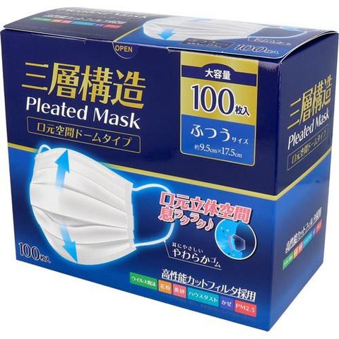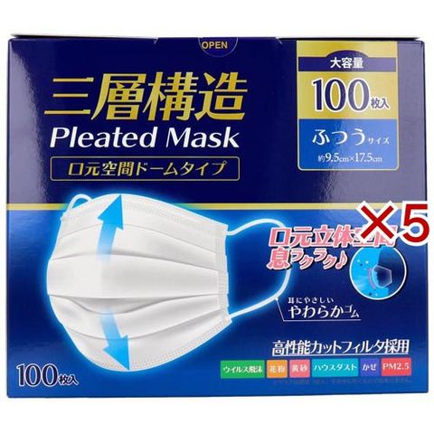 三層構造プリーツマスク 口元空間ドームタイプ ふつうサイズ 大容量 (100枚入×5セット)