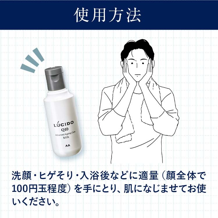 ・洗顔、ヒゲそり、入浴後などに 適量(顔全体で100円玉程度)を手にとり 肌になじませてお使いください