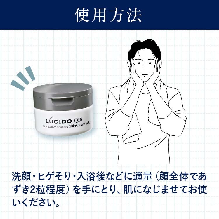 ・洗顔、ヒゲそり、入浴後などに 適量(顔全体であずき2粒程度)を手にとり 肌になじませてお使いください