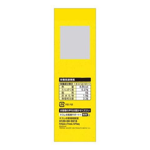 | 1本(4.5g)当たり 熱量:8.8kcal たんぱく質:0.27g 脂質:0g 炭水化物:1.9g 食塩相当量:2.2g |