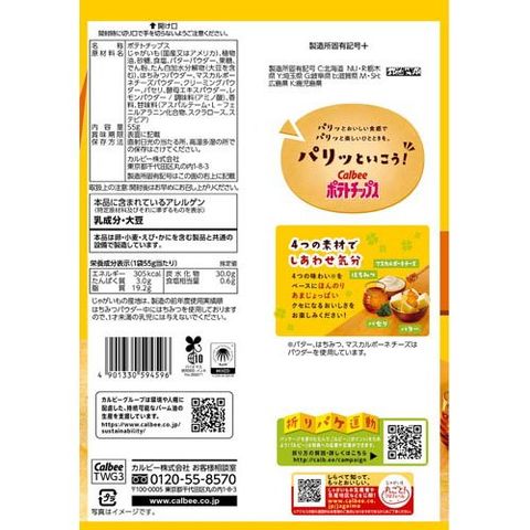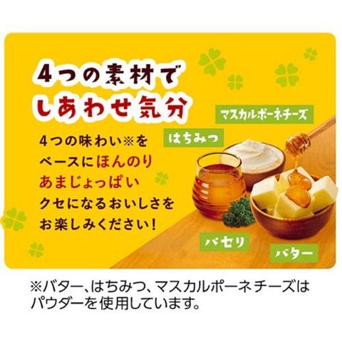 | じゃがいも(国産又はアメリカ)、植物油、砂糖、食塩、バターパウダー、果糖、でん粉、たん白加水分解物(大豆を含む)、はちみつパウダー、マスカルポーネチーズパウダー、クリーミングパウダー、パセリ、酵母エキスパウダー、レモンパウダー / 調味料(アミノ酸)、香料、甘味料(アスパルテーム・L-フェニルアラニン化合物、スクラロース、ステビア) |