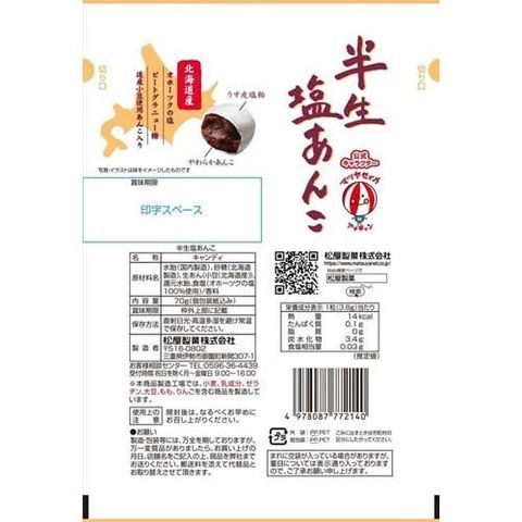 ●北海道産小豆使用餡子・オホーツク産塩・ビートグラニュー糖、3つの北海道原料にこだわって作った、外はカリッと食感、中はしっとり柔らか半生食感のあんこをたっぷり詰め込んだ薄皮キャンディです。