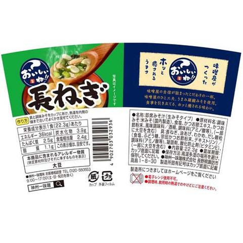 | 調味みそ:米みそ(国内製造)、食塩、かつお節エキス、かつお節粉末、風味調味料/酒精、調味料(アミノ酸等)、(一部に大豆を含む) 具:長ねぎ、油あげ、わかめ、だし顆粒(食塩、ぶどう糖、宗田かつお節粉末、デキストリン)/調味料(アミノ酸等)、凝固剤、酸化防止剤(ビタミンE)、(一部に大豆を含む) |