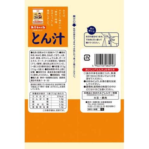 | 米みそ、豚肉、玉ねぎ、ごぼう、人参、ねぎ、食塩、ばれいしょでん粉、ポークエキス、ラード、かつお節粉末/調味料(アミノ酸等)、酸化防止剤(ビタミンE)、(一部に大豆・豚肉を含む) |