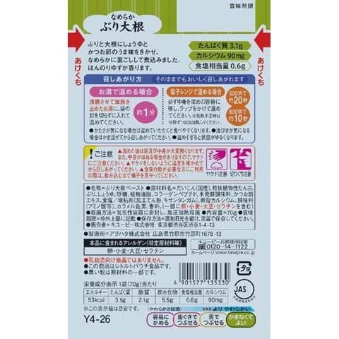 | だいこん(国産)、粒状植物性たん白、ぶり、しょうゆ、砂糖、植物油脂、コラーゲンペプチド、米発酵調味料、かつお節エキス、食塩/増粘剤(加工でん粉、キサンタンガム)、卵殻カルシウム、調味料(アミノ酸等)、カラメル色素、香料、(一部に卵・小麦・大豆・ゼラチンを含む) |