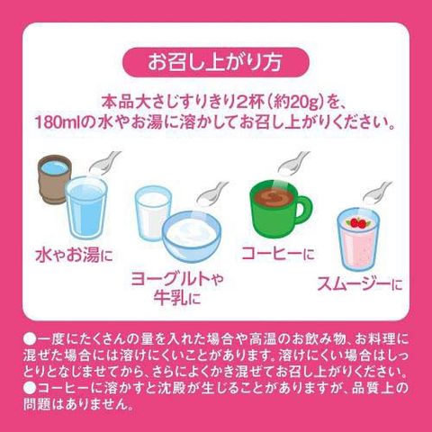 | 1食分(20g)当たり エネルギー:72kcal、たんぱく質:7.44g、脂質:0.18g、炭水化物:10.08g、食塩相当量:0.24g、カルシウム:227mg、鉄:8.1mg、ビタミンC:100mg/コラーゲン:1000mg、シールド乳酸菌(殺菌):100億個配合 |