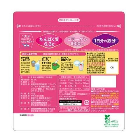 ●低脂肪、高たんぱく、カルシウム含有のスキムミルクに、女性に嬉しいコラーゲン、1日分※の鉄分(1食20g当たり)、ビタミンC、シールド乳酸菌配合。