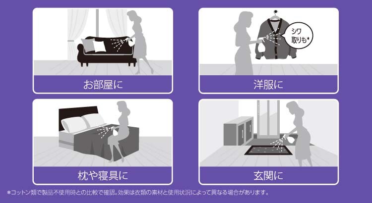 しっかり除菌・消臭するために、まくら、クッションは表と裏6回、布団・カーペットは20回、スーツ・制服のジャケットは10回ずつを目安に表面を隙間なくスプレーする。