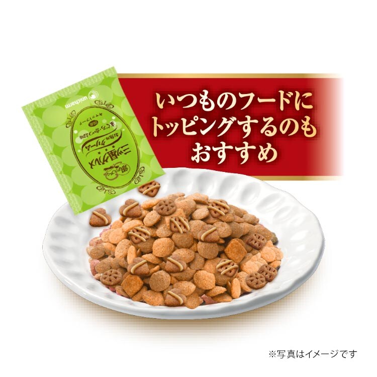 | タンパク質:30.0%以上、脂質:16.0%以上、粗繊維:5.0%以下、粗灰分:7.0%以下、水分:10.0%以下、約390kcaL/100gあたり |