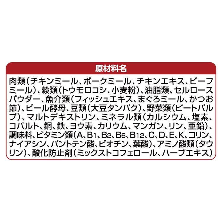 | 肉類(チキンミール、ポークミール、チキンエキス、ビーフミール)、穀類(トウモロコシ、小麦粉)、油脂類、セルロースパウダー、魚介類(フィッシュエキス、まぐろミール、かつお節)、ビール酵母、豆類(大豆タンパク)、野菜類(ビートパルプ)、マルトデキストリン、ミネラル類(カルシウム、塩素、コバルト、銅、鉄、ヨウ素、カリウム、マンガン、リン、亜鉛)、調味料、ビタミン類(A、B1、B2、B6、B12、C、D、E、K、コリン、ナイアシン、パントテン酸、ビオチン、葉酸)、アミノ酸類(タウリン)、酸化防止剤(ミックストコフェロール、ハーブエキス) |