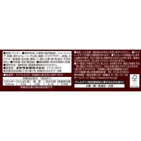 | 小麦粉(国内製造)、ショートニング、砂糖、準チョコレート、でん粉、鶏卵、ココアパウダー、食塩、スパイス/膨張剤、乳化剤、香料、(一部に小麦・卵・乳成分・大豆を含む) |