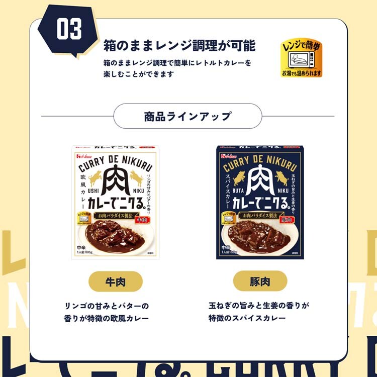 | ★カレーでニクる。牛肉 牛肉、牛脂豚脂混合油、小麦粉、砂糖、チャツネ、みそ、でんぷん、砂糖混合ぶどう糖果糖液糖、ウスターソース、カレーパウダー、トマトペースト、りんご濃縮果汁、ソテーオニオン、牛脂、食塩、ガーリックペースト、米粉、焦がしバターオイル、オニオンパウダー、酵母エキス加工品、ガーリックパウダー、香辛料、ビーフ風味調味料、焙煎フェヌグリーク/調味料(アミノ酸等)、カラメル色素、増粘剤(加工デンプン)、乳化剤、酸化防止剤(ビタミンE)、香料、酸味料、香辛料抽出物、(一部に乳成分・小麦・牛肉・大豆・豚肉・りんごを含む) ★カレーでニクる。豚肉 豚肉、砂糖混合ぶどう糖果糖液糖、牛脂豚脂混合油、でんぷん、トマトペースト、乾燥玉ねぎ、しょうがペースト、砂糖、みそ、おからパウダー、香辛料、小麦粉、ソテーオニオン、ガーリックペースト、食塩、ビーフエキス、ウスターソース、料理酒、しょう油、りんご濃縮果汁、カレーパウダー、ぶどう果汁加工品、焙煎香辛料ペースト、焙煎唐がらし/調味料(有機酸等)、増粘剤(加工デンプン)、カラメル色素、乳化剤、酸化防止剤(ビタミンE)、香料、香辛料抽出物、(一部に小麦・牛肉・大豆・豚肉・りんごを含む) ★スープカリーの匠 レトルト 野菜(じゃがいも(国産)、にんじん、赤ピーマン)、鶏肉、ゆで卵、トマトペースト、調味油、香辛料、牛脂豚脂混合油、粉末みそ、ピーマンペースト、食塩、砂糖、チキンシーズニング、でんぷん、ガーリックペースト、しょうがペースト、ナンプラー、ガーリックパウダー、チキンブイヨン、ブイヨン、ポークブイヨン/調味料(アミノ酸等)、塩化Ca、重曹、カラメル色素、乳化剤、酸味料、香料、香辛料抽出物、(一部に卵・小麦・牛肉・大豆・鶏肉・豚肉を含む) |