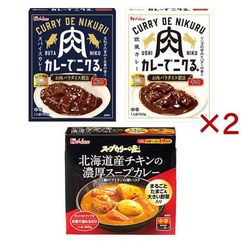 | 4902402921098 160g カレーでニクる。 牛肉 4902402921104 160g カレーでニクる。 豚肉 4902402865828 スープカリーの匠 北海道産チキンの濃厚スープカレー 各1 |