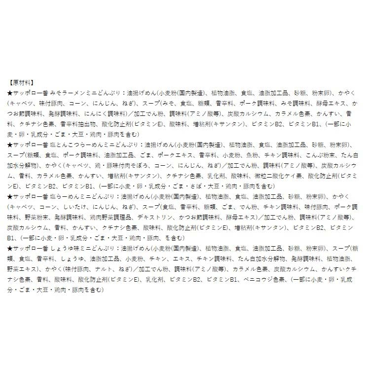 | ★サッポロ一番 みそラーメンミニどんぶり:小麦、卵、乳成分、ごま、大豆、鶏肉、豚肉 ★サッポロ一番 塩とんこつらーめんミニどんぶり:小麦、卵、乳成分、ごま、さば、大豆、鶏肉、豚肉 ★サッポロ一番 塩らーめんミニどんぶり:小麦、卵、乳成分、ごま、大豆、鶏肉、豚肉 ★サッポロ一番 しょうゆ味ミニどんぶり:小麦、卵、乳成分、ごま、大豆、鶏肉、豚肉 |