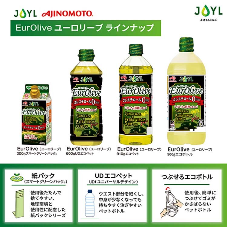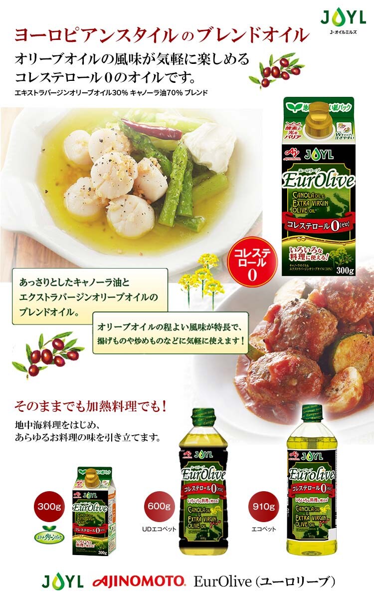 ●ユーロリーブ は、あっさりとしたキャノーラ油に香り豊かなエクストラバージンオリーブオイルをブレンドしたヨーロピアンスタイルのブレンドオイルです。