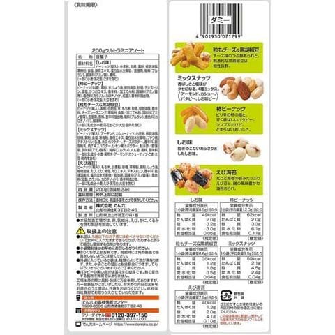| ★しお味:ピーナッツ(輸入)、小麦粉、砂糖、澱粉、植物油脂、寒梅粉、食塩、酵母エキス、蛋白加水分解物/膨張剤、糊料(プルラン)、調味料(アミノ酸)、香料、(一部に小麦・落花生・ごまを含む) ★柿ピーナッツ:ピーナッツ(中国)、澱粉、米、しょう油、植物油脂、砂糖、デキストリン、食塩、かつおエキス、香辛料/加工でん粉、調味料(アミノ酸等)、着色料(カラメル、カロチノイド、紅麹)、香辛料抽出物、(一部に小麦・落花生・大豆を含む) ★粒もチーズ&黒胡椒豆:ピーナッツ(輸入)、澱粉、小麦粉、米、もち米、砂糖、植物油脂、香辛料、チーズシーズニング、寒梅粉、食塩/加工でん粉、調味料(アミノ酸等)、膨張剤、香料、香辛料抽出物、糊料(プルラン)、着色料(カロチノイド)、酸味料、(一部に乳成分・小麦・落花生・ごま・大豆・豚肉を含む) ★ミックスナッツ:ピーナッツ(輸入)、アーモンド、カシューナッツ、小麦粉、植物油脂、砂糖、澱粉、食塩、寒梅粉、酵母エキス、蛋白加水分解物、ブドウ糖、デキストリン、乳糖、ホエイパウダー、チーズパウダー、香辛料、脱脂粉乳、肉エキスパウダー、レモン果汁パウダー、粉末酢/膨張剤、調味料(アミノ酸等)、糊料(プルラン)、くん液、香料、酸味料、(一部に乳成分・小麦・落花生・アーモンド・カシューナッツ・ごま・大豆・鶏肉を含む) ★えび海苔:ピーナッツ(輸入)、もち米、小麦粉、砂糖、寒梅粉、澱粉、しょう油、植物油脂、えび、のり、食塩、えびエキス、デキストリン、香辛料、風味調味料、蛋白加水分解物/膨張剤、調味料(アミノ酸等)、着色料(紅麹、カラメル、カロチノイド)、香辛料抽出物、(一部に乳成分・小麦・えび・落花生・大豆を含む) |
