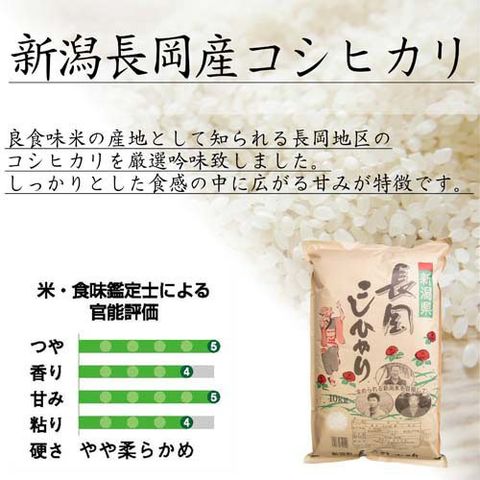 | ・産地:新潟県長岡市 ・品種:コシヒカリ ・使用割合:単一原料米 ・精米年月日:表示上部記載 |