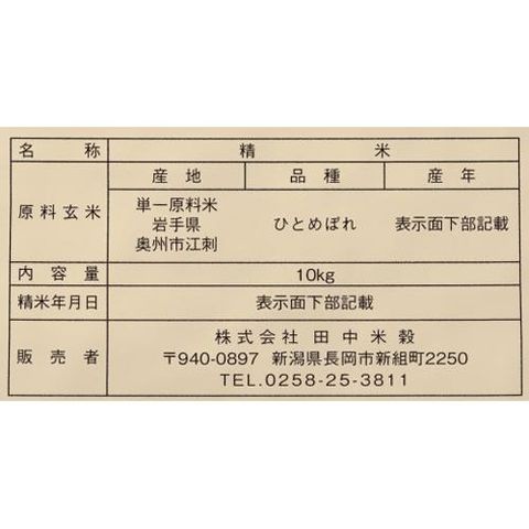 | ・産地:岩手県奥州市江刺区 ・品種:ひとめぼれ ・使用割合:単一原料米 ・精米年月日:表示面下部記載 |