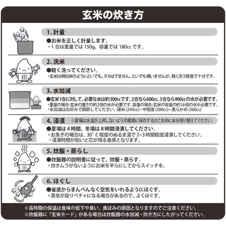 ・玄米の容量の約1.6倍、重量の約2倍(約300cc)の水の量が必要です。