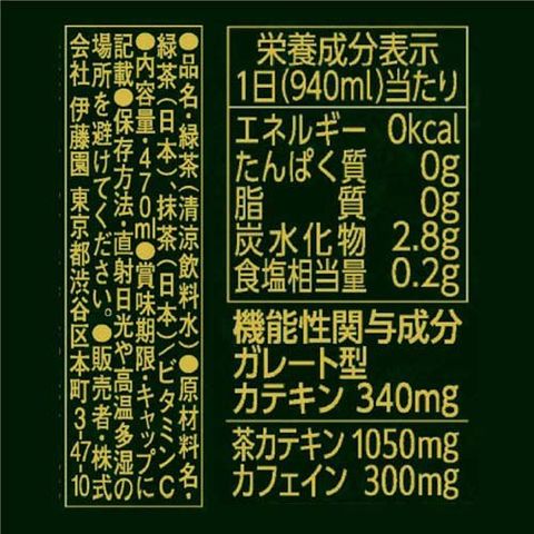 | 1日(940ml)当たり エネルギー:0kcal、たんぱく質:0g、脂質:0g、炭水化物:2.8g、食塩相当量:0.2g 機能性関与成分:ガレート型カテキン:340mg 茶カテキン:1050mg、カフェイン:300mg |