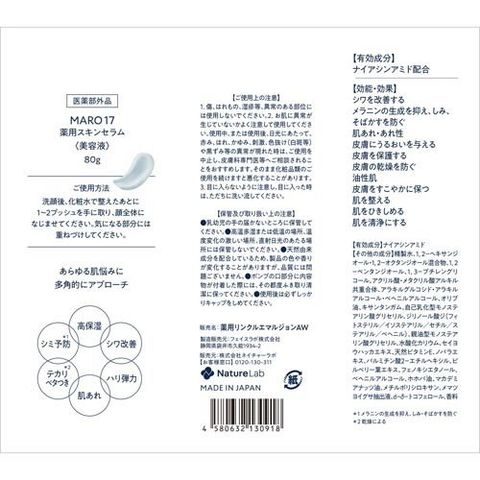 | 有効成分:ナイアシンアミド その他の成分:精製水、1.2-ヘキサンジオール・1.2-オクタンジオール混合物、1.2-ペンタンジオール、1.3-ブチレングリコール、アクリル酸・メタクリル酸アルキル共重合体、アラキルグルコシド・アラキルアルコール・ベヘニルアルコール、オリブ油、キサンタンガム、自己乳化型モノステアリン酸グリセリル、ジリノール酸ジ(フィトステリル/イソステアリル/セチル/ステアリル/ベヘニル)、親油型モノステアリン酸グリセリル、水酸化カリウム、セイヨウハッカエキス、天然ビタミンE、ノバラエキス、パルミチン酸2-エチルヘキシル、ビルベリー葉エキス、フェノキシエタノール、ベヘニルアルコール、ホホバ油、マカデミアナッツ油、メチルポリシロキサン、メマツヨイグサ抽出液、d-δ-トコフェロール、香料 |