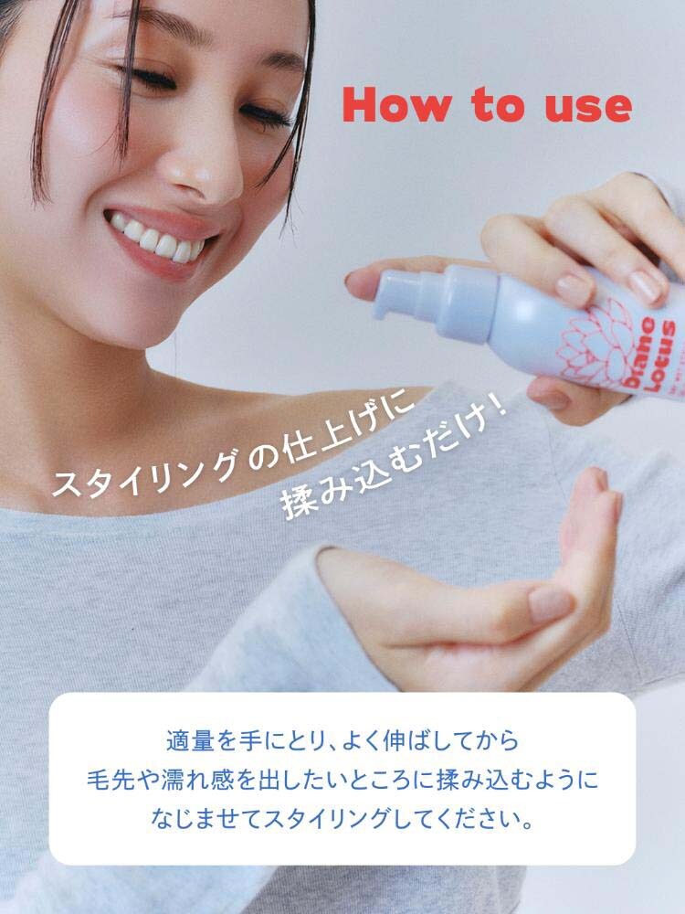適量を手にとり、よく伸ばしてから毛先や濡れ感を出したい ところに揉み込むようになじませてスタイリングしてください。