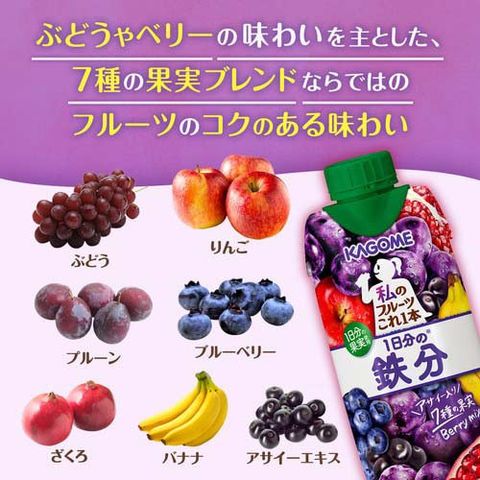 ●ぶどうやベリーのおいしさを楽しみながら、手軽に1日分(※1)の鉄分をチャージでき、1日分の果実(※2)を使用した果汁入り飲料 ブルーベリー、アサイー等には鉄分が含まれています。