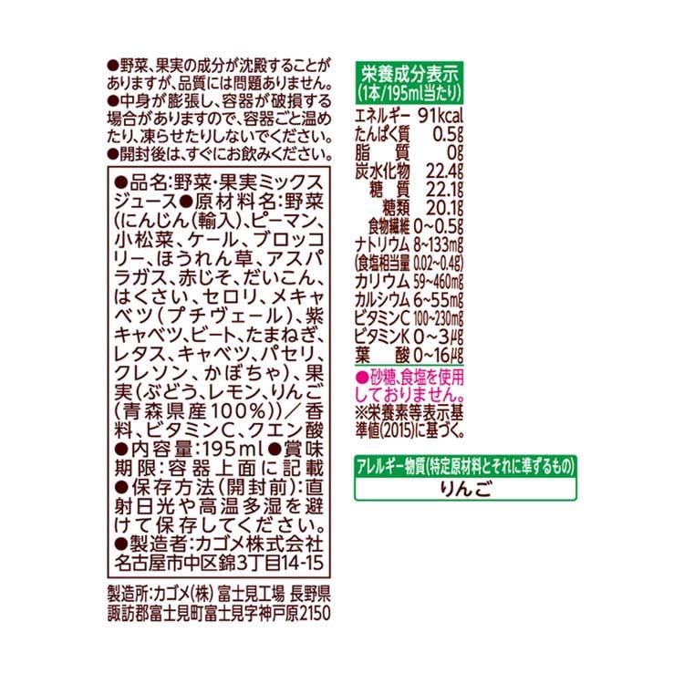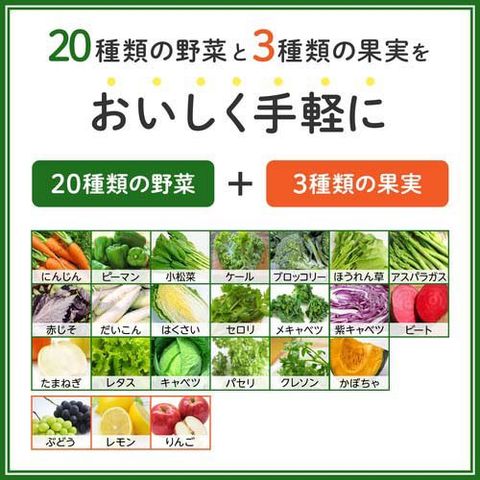 | 野菜(にんじん(輸入)、ピーマン、小松菜、ケール、ブロッコリー、ほうれん草、アスパラガス、赤じそ、だいこん、はくさい、セロリ、メキャベツ(プチヴェール)、紫キャベツ、ビート、たまねぎ、レタス、キャベツ、パセリ、クレソン、かぼちゃ)、果実(ぶどう、レモン、りんご(青森県産100%))/香料、ビタミンC、クエン酸 |
