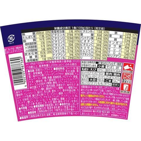 | 1食(109g)当たり エネルギー:450kcal、たんぱく質:17.8g、脂質:14.7g、炭水化物:65.5g、食塩相当量:2.9g、ビタミンB1:0.7mg、ビタミンB2:0.7mg、カルシウム:241mg |