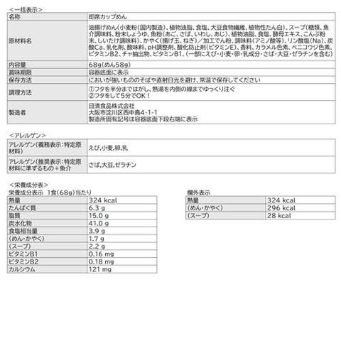| 油揚げめん(小麦粉(国内製造)、植物油脂、食塩、大豆食物繊維、植物性たん白)、スープ(糖類、魚介調味料、粉末しょうゆ、魚粉(あご、さば、いわし、あじ)、植物油脂、食塩、酵母エキス、こんぶ粉末、しいたけ調味料)、かやく(揚げ玉、ねぎ)/加工でん粉、調味料(アミノ酸等)、リン酸塩(Na)、炭酸Ca、乳化剤、酸味料、pH調整剤、酸化防止剤(ビタミンE)、香料、カラメル色素、ベニコウジ色素、ビタミンB2、チャ抽出物、ビタミンB1、(一部にえび・小麦・卵・乳成分・さば・大豆・ゼラチンを含む) |