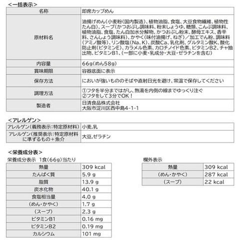 | 油揚げめん(小麦粉(国内製造)、植物油脂、食塩、大豆食物繊維、植物性たん白)、スープ(かつおぶし調味料、粉末しょうゆ、糖類、こんぶ調味料、植物油脂、食塩、たん白加水分解物、かつおぶし粉末、酵母エキス、香辛料、さんしょう調味料)、かやく(味付油揚げ、ねぎ)/加工でん粉、調味料(アミノ酸等)、リン酸塩(Na、K)、炭酸Ca、乳化剤、グルタミン酸K、酸化防止剤(ビタミンE)、カラメル色素、カロチノイド色素、ビタミンB2、チャ抽出物、ビタミンB1、(一部に小麦・乳成分・大豆・ゼラチンを含む) |