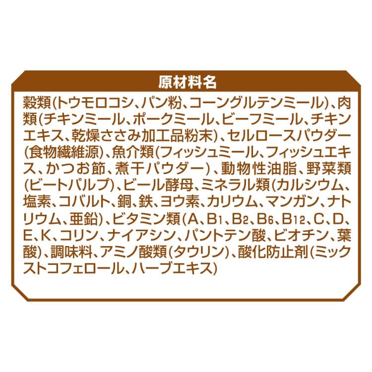 | 穀類(トウモロコシ、パン粉、コーングルテンミール)、肉類(チキンミール、ポークミール、ビーフミール、チキンエキス、乾燥ささみ加工品粉末)、セルロースパウダー(食物繊維源)、魚介類(フィッシュミール、フィッシュエキス、かつお節、煮干パウダー)、動物性油脂、野菜類(ビートパルプ)、ビール酵母、ミネラル類(カルシウム、塩素、コバルト、銅、鉄、ヨウ素、カリウム、マンガン、ナトリウム、亜鉛)、ビタミン類(A、B1、B2、B6、B12、C、D、E、K、コリン、ナイアシン、パントテン酸、ビオチン、葉酸)、調味料、アミノ酸類(タウリン)、酸化防止剤(ミックストコフェロール、ハーブエキス) |